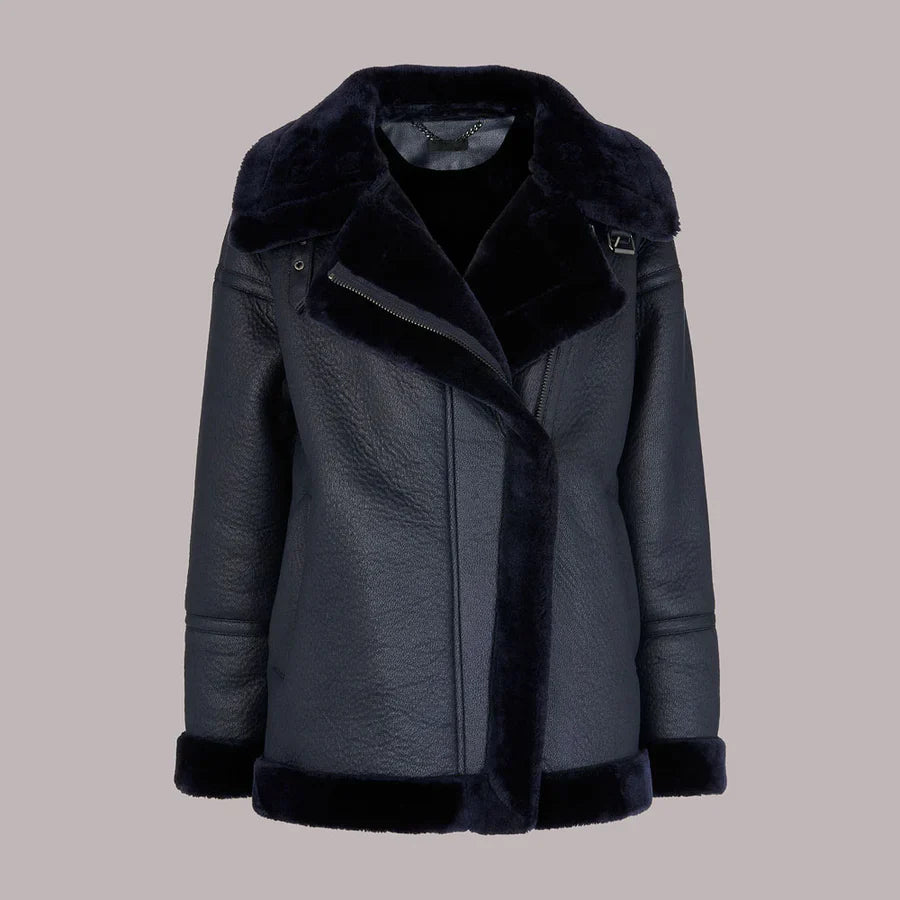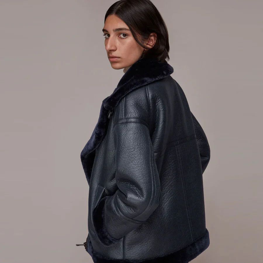 Womens Black Aviator Biker Genuine Sheepskin Shearling Leather Jacket